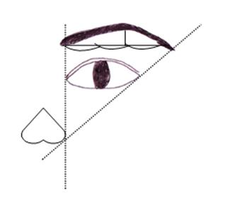 眉毛は顔全体の印象に大きく影響を与え,図5に示すような鼻と目の位置からバランスのよい整え方が望まれる[7].しかし左右対称の適切なアイブロウは視覚健常者でも難しいため,アイブロウテンプレートなどのツールが提供されている.これを用いると,鼻,目頭,目尻,眉頭の位置から定まる位置に,メイクする者が希望する"眉毛イメージ"の眉毛形状[8]のテンプレートをあてがって,眉毛を書くことができる.