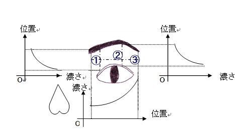 アイシャドウは瞼に対して図6のような濃さでベースを眉下からまぶた全体になじませる.濃さの変化率に不自然さがあるとき,化粧支援システムはその位置を図6の中に示すロケーションモデルに対応する表3のロケーションの呼称によって知らせる.