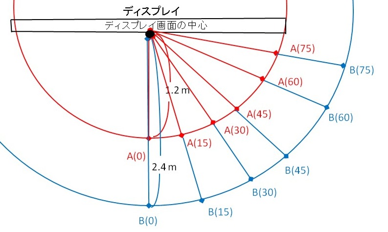 図2に示すとおり,ディスプレイの画面中心からの法線方向に1.2 mおよび2.4 m離れた点A(0), B(0)を画面のレビュー位置とする.さらに法線方向から水平に15°ずつ移動したレビュー位置を,A(15), A(30), A(45), A(60), A(75),B(15), B(30), B(45), B(60), B(75)として,それらのレビュー位置から,4名の被験者P1, P2, P3, P4に画面上の試験用テキストを見てもらい,もっと前に回り込んで読みたいと感じるほど見づらいレビュー位置を"×"で評価してもらう.その結果を表2に示す.